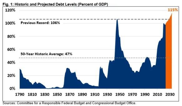 - Record debt levels. Debt held by the public is on track to reach 115% of GDP in 2033 from its current level of 100% of GDP today (see chart below).