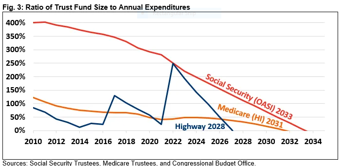 - Looming Trust Fund Insolvency. The highway trust fund, the Medicare Hospital Insurance trust fund, and the Social Security trust fund will all soon be depleted (see chart below).