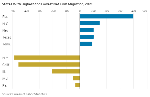 - Migration. After the 2020 census, Texas gained two congressional seats, and Florida and North Carolina each gained one. Also, California, Illinois, and New York each lost one seat. This corresponds to the significant business and personal migration which took place in 2021 because of unnecessary Covid lockdowns as well as much higher tax rates in the out-migration states (see chart below). In other words, more attractive state policies on social and tax issues will draw people from the more oppressive states.