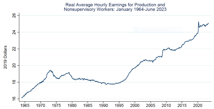 • Our economy is strong. Our free enterprise economic system has made us the strongest country in the world.  Real average hourly earnings for production and nonsupervisory workers are on a long-term upward trajectory (see chart).  Yes, they are down in the last two and a half years because of inflation, but the Federal Reserve will eventually bring inflation back to the desired 2% level, as painful and dragged out as this process may prove to be.