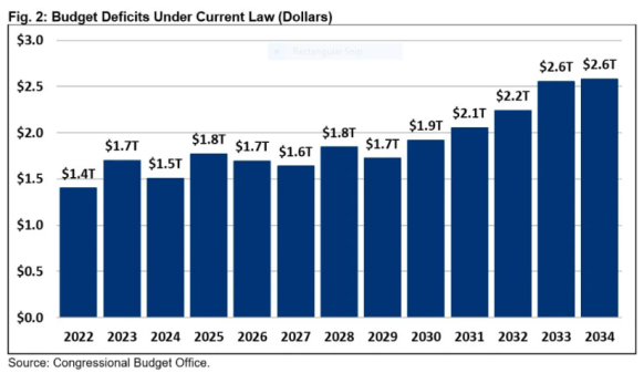 Furthermore, the Congressional Budget Office is now projecting additional deficits totaling $20 trillion over the next ten years (see the attached chart).