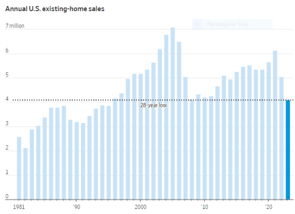 • Interest Rates. The Federal Reserve has raised short-term interest rates to the highest level in years to fight inflation.  Of course, this means much higher interest payments on our exploding national debt.  In addition, home sales in 2023 were at a 28-year low (see attached chart), because of high mortgage rates.