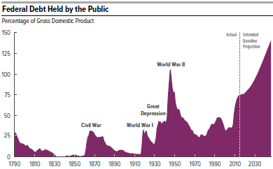 The readers of this blog know that my favorite topic is our very large national debt, now 77% of GDP (for the public part on which we pay interest) and predicted by the Congressional Budget Office to keep steadily getting worse, without major changes in current policy.