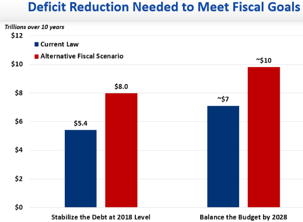 - To balance the budget by 2028 (allowing ten years to accomplish this) would take a savings of least $7 trillion over the next decade. This would mean reducing annual deficits by $700 billion per year on average, an extremely difficult task.