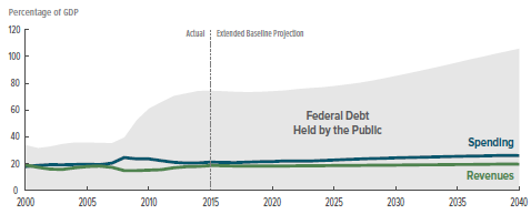We have very high debt and Paul Krugman says in “Debt Is Good” that we need more! The Congressional Budget Office’s latest report this week, “An Update to the Budget and Economic Outlook: 2015 – 2025” predicts slow economic growth for the next ten years, averaging 2.1% per year (see chart below).