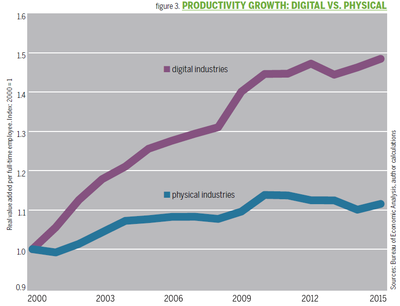 - At 2.7%, productivity growth in the digital industries over the past 15 years has been strong, compared with only an anemic .7% annual growth in productivity in the physical industries.